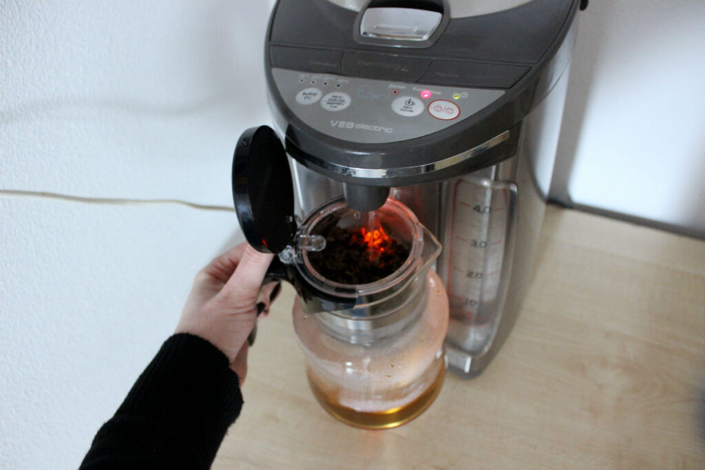 Następnie zalewamy herbatę gorącą wodą po brzegi. Zakrywamy pokrywkę i naciskamy na przycisk. Przycisk otwiera zawór na dolnej części pojemnika do zaparzania, więc musimy go przytrzymać, dopóki cały napar nie wyleje się do czajnika.