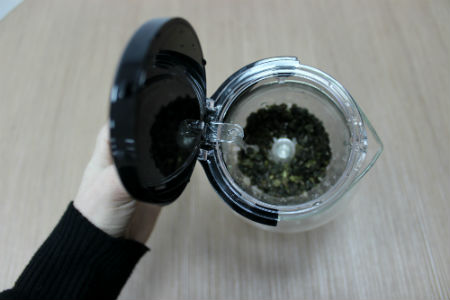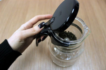 1. Otwórz pokrywkę i wsyp 5-7g gramów herbaty (pół łyżeczki) do górnej pojemniczki. (na 100 ml)